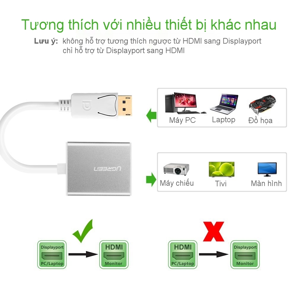 - Cáp chuyển Displayport to HDMI ugreen 20411, cung cấp một cách thuận tiện để kết nối màn hình HDMI, màn hình, máy chiếu, HDTV của bạn để Displayport Laptop, PC, card đồ họa của bạn bằng cách sử dụng một cáp HDMI (không bao gồm Cáp HDMI). Các trường hợp đặc biệt tăng cường nhôm performance.It chống nhiễu của nó là với thiết kế thanh lịch và kích thước nhỏ gọn, đó là lý tưởng cho các bài thuyết trình, đào tạo, hội nghị.