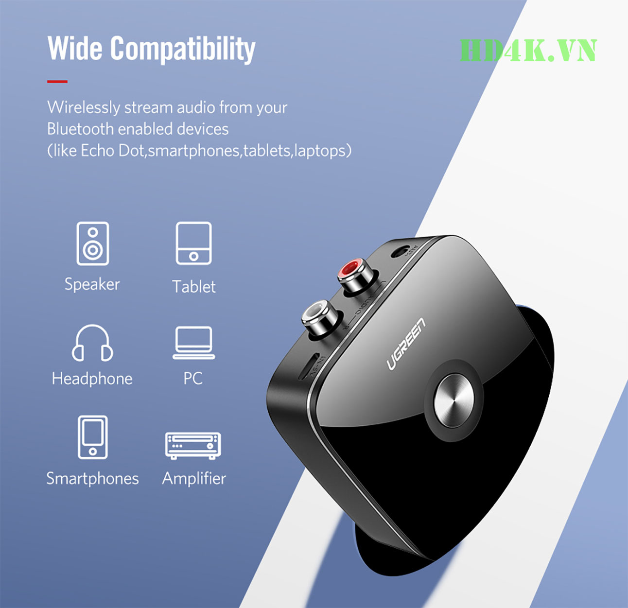 - Thiết bị nhận Bluetooth Music Receiver 5.1 Ugreen 40759 được thiết kế để nhận nhạc từ PC, iPhone, iPad, máy tính bảng hoặc máy nghe nhạc MP3 với thiết bị âm thanh sử dụng tại nhà của bạn, loa hoặc hệ thống giải trí với cổng 3,5 mm và cổng RCA. Với thiết bị này các bạn có thể chuyển đổi loa bình thường của bạn thành một loa bluetooth không dây.
