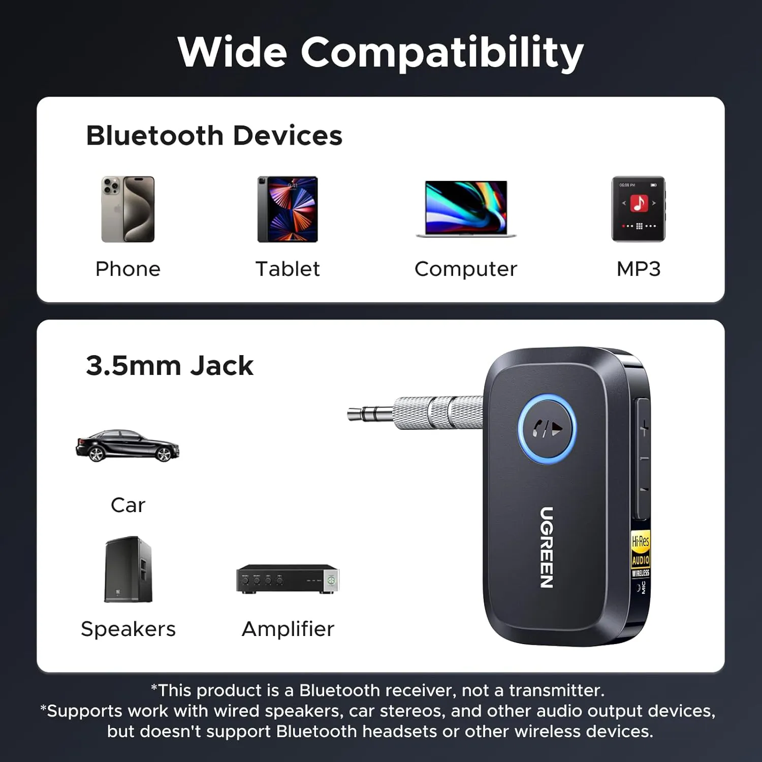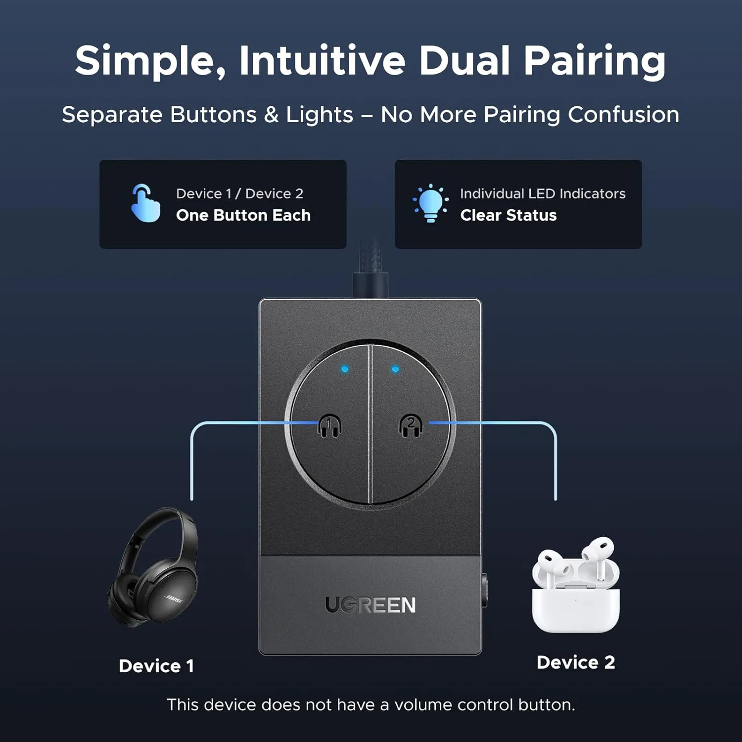 - Biến thiết bị nguồn có cổng âm thanh có dây (như TV, laptop, máy game, dàn âm thanh) thành thiết bị phát không dây: bạn chỉ cần kết nối UGREEN 65706 vào cổng 3.5mm AUX của thiết bị nguồn, bật thiết bị, ghép nối với tai nghe hoặc loa Bluetooth — từ đó âm thanh sẽ phát không dây tới tai nghe/loa..
