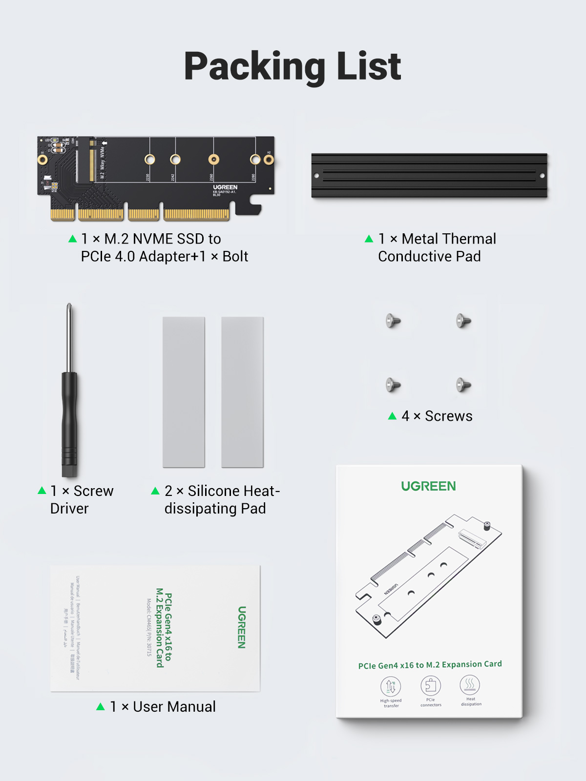 - Card PCIe 4.0(16×) to M.2 NVMe Expansion Card Ugreen 30715: tích hợp PCIe 4.0 (kích thước vật lý 16X, băng thông 4X), tốc độ truyền của Bộ điều hợp PCIe M.2 này lên đến 64Gbps và tương thích ngược với PCIe 3.0 / 2.0 / 1.0.