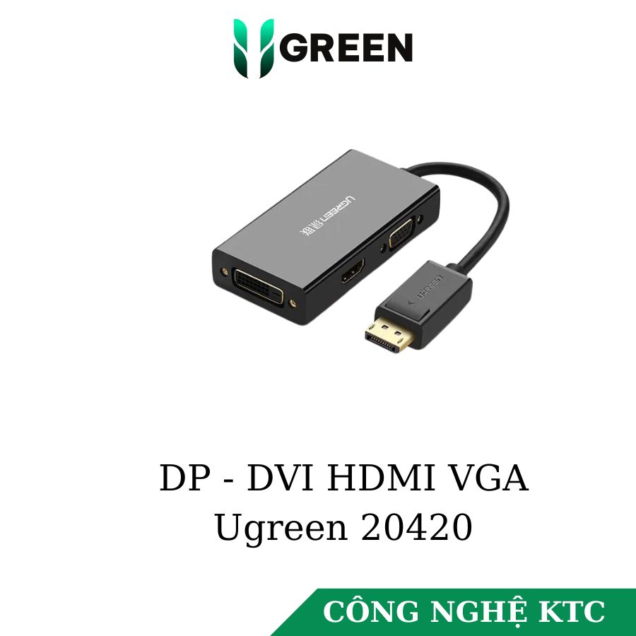 - Cáp chuyển DisplayPort to HDMI, VGA, DVI Ugreen 20420, thiết bị chuyển đổi DisplayPort 3 trong 1 giúp bạn sở hữu được 3 loại chuyển đổi DisplayPort to DVI, DisplayPort to HDMI, DisplayPort to VGA.