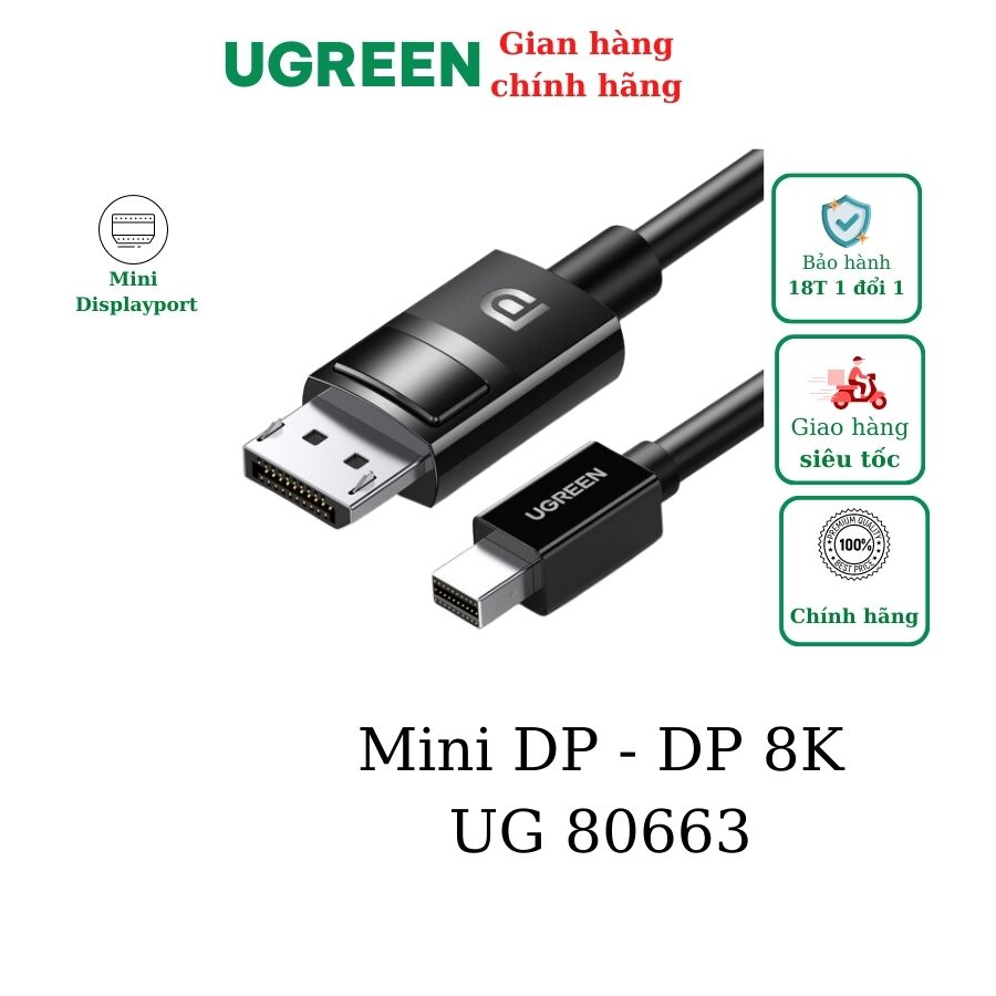 - Cáp Mini DisplayPort to Displayport dài 1.5M Ugreen 80663 chuyển đổi cáp cung cấp một giải pháp hiệu quả để kết nối một máy tính xách tay Mini DisplayPort cho phép (MacBook, MacBook Pro, MacBook Air) với màn hình DisplayPort tiêu chuẩn, hoặc DisplayPort trang bị HDTV.
