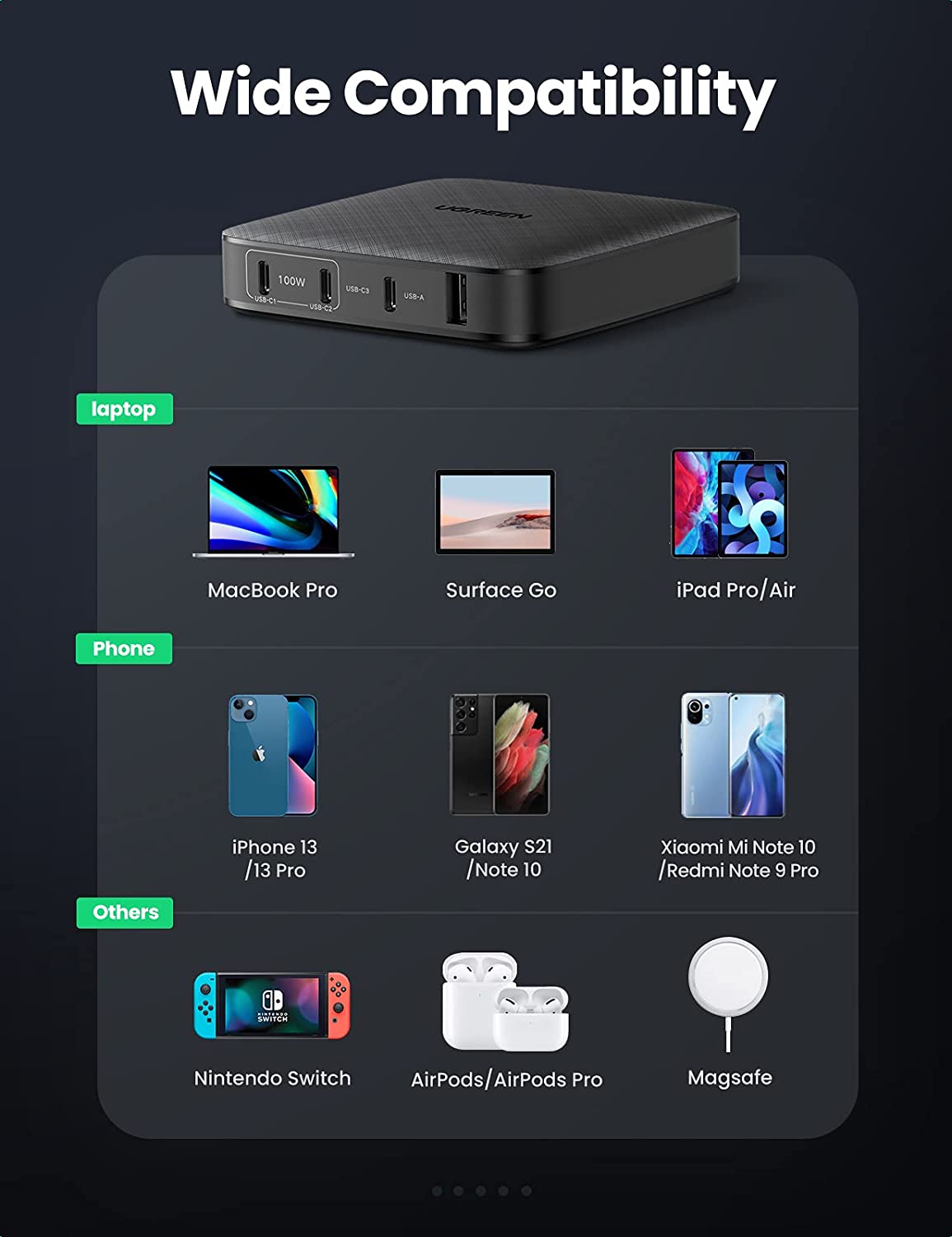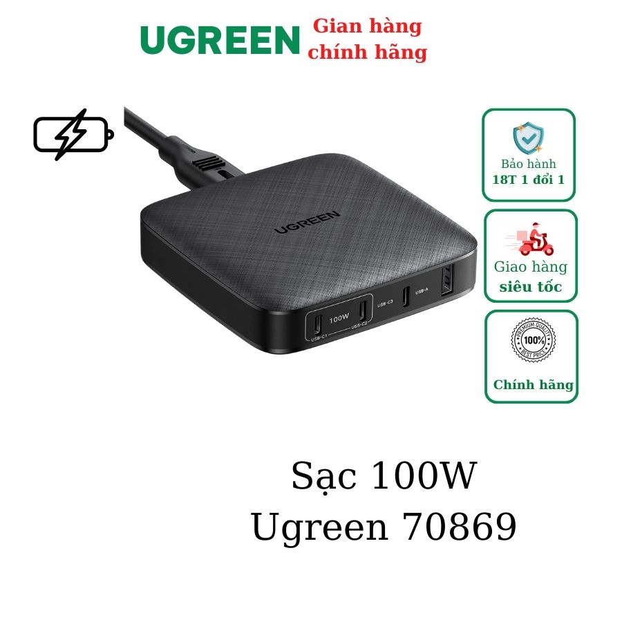 - Bộ sạc để bàn UGREEN 100W USB C Ugreen 70869 có thể sạc 4 thiết bị đồng thời, tránh dây điện lộn xộn và tiết kiệm nhiều không gian hơn trên máy tính để bàn của bạn.