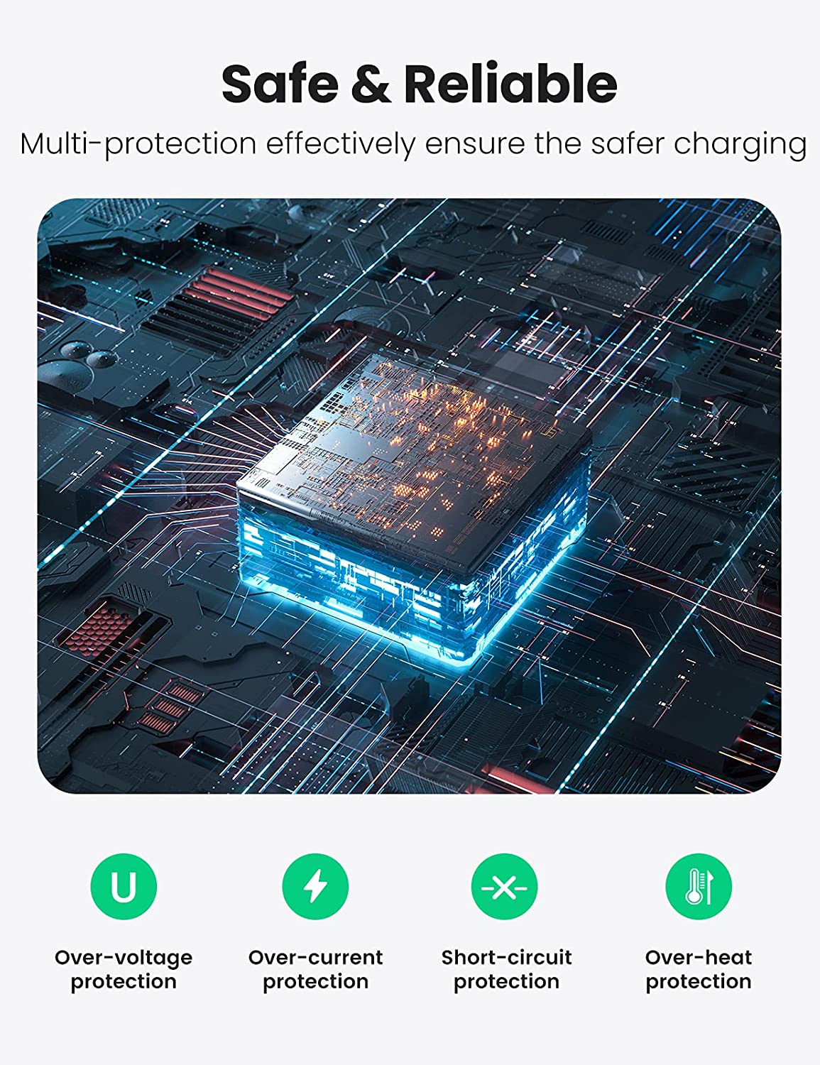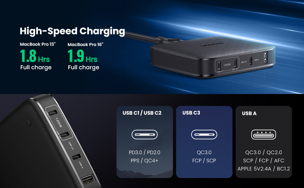 - Sạc tốc độ cao: Bộ sạc để bàn UGREEN 100W USB C Ugreen 70869 hỗ trợ Power Delivery 3.0 / 2.0, Quick Charge 4.0 + / 3.0, SCP, AFC, 5V / 2.4A, PPS 25W / 45W Sạc siêu nhanh 2.0. Sạc đầy MacBook Pro 16 inch chỉ trong 1,9 giờ.