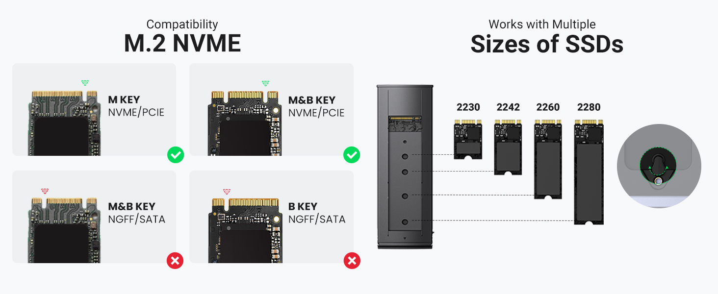 - Vỏ SSD NVMe không có công cụ cho phép cài đặt nhanh chóng và dễ dàng. Cắm và chạy, không cần trình điều khiển. Thiết kế khóa của vỏ SSD M.2 có thể đảm bảo truyền nhanh và ổn định. (Không hỗ trợ SSD SATA)