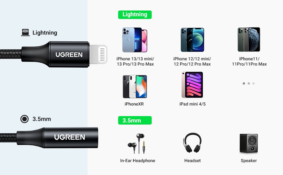 - Cáp chuyển Lightning sang Audio 3.5mm Ugreen 70860 này cho phép bạn sử dụng tai nghe 3,5mm hiện có của mình với iPhone 13/13 mini / 13 Pro / 13 Pro Max / 12/12 mini / 12 Pro / 12 Pro Max / 11/11 Pro / 11 Pro Max / XS / XS Max / XR / X / 8 7 6 Plus, iPod touch Thế hệ thứ 6, iPad 9 / iPad mini / iPad Air / iPad Pro.
