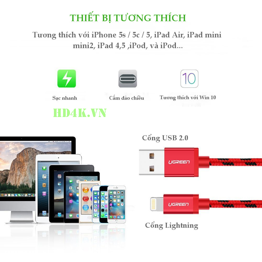 - Cáp sạc USB Lightning Ugreen cho iPhone , iPad vỏ bọc lưới chuẩn MFI Apple sử dụng ổn định và không bị báo lỗi phụ kiện cho các dòng máy iPhone và các đời IOS. Ugreen thiết kế sợi cáp với băng thông 5V-2.4A