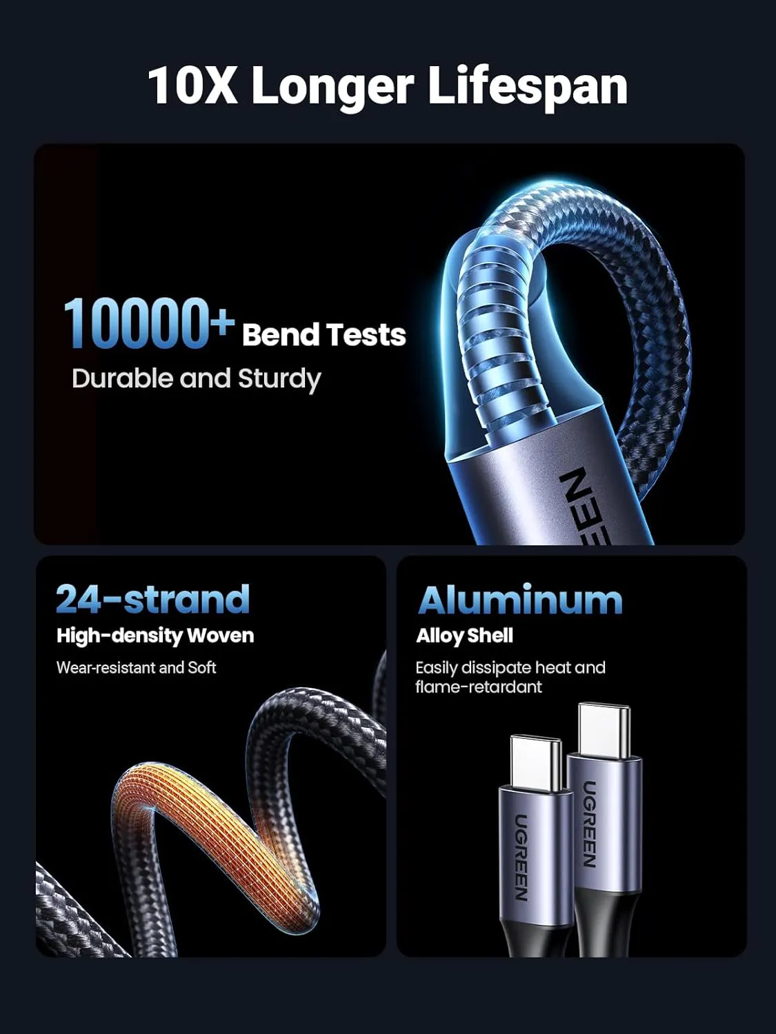 - Chất lượng cao cấp: Cáp bện nylon chắc chắn và bền bỉ đảm bảo tuổi thọ cao hơn, lên đến 10.000 lần uốn cong. Đầu nối USB C hai mặt với lớp bảo vệ chống đứt gãy được thiết kế để cắm rút thường xuyên. Vỏ nhôm, dây đồng tinh khiết cao, ba lớp chắn sẽ duy trì hiệu suất sạc nhanh lâu dài.