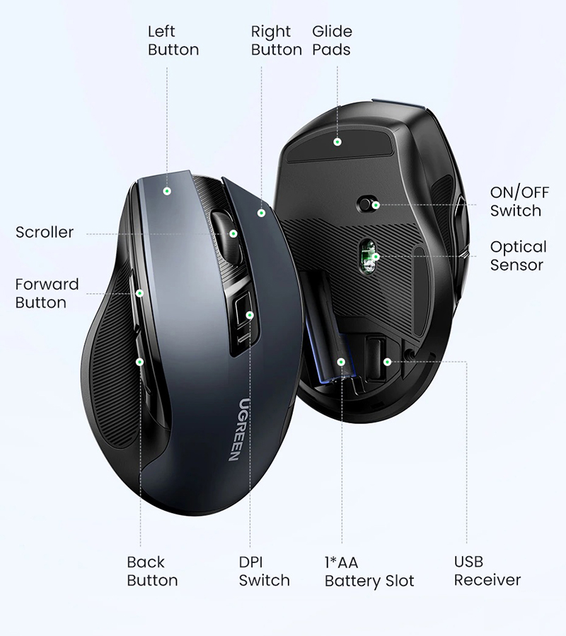 - Chuột không dây Bluetooth 5.0 Ergonomic 4000 DPI 6 nút bấm im lặng cho MacBook máy tính bảng Laptop 2.4G Ugreen 15508 với hai chế độ kết nối Bluetooth 5.0 & 2.4G thiết kế Ergonomic cho cảm giác cầm nắm thoải mái, tránh đau mỏi vai, cổ tay sau thời gian dài làm việc.