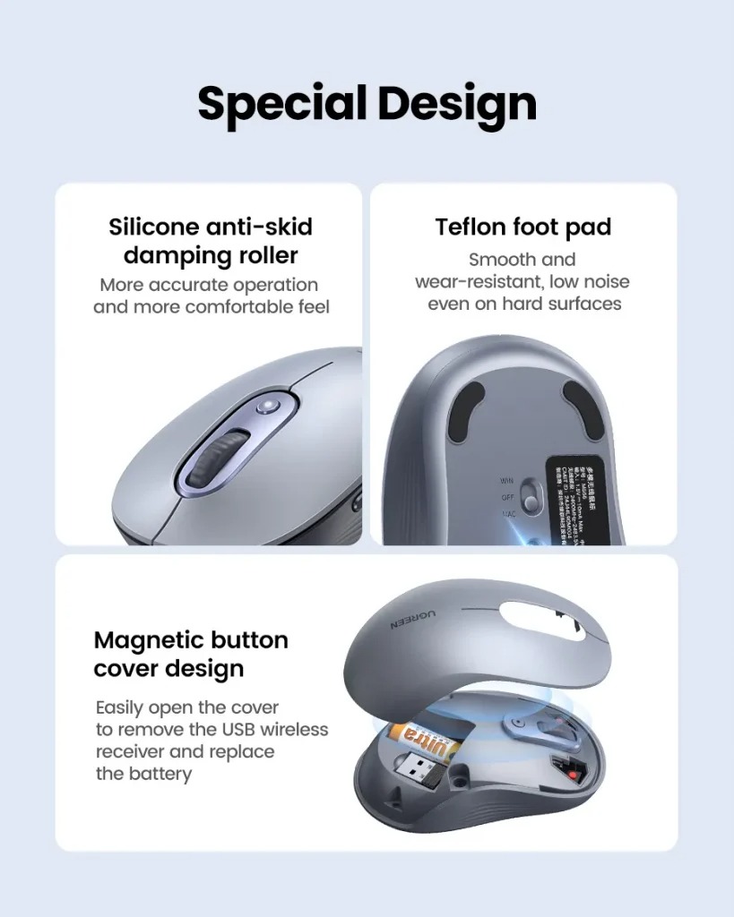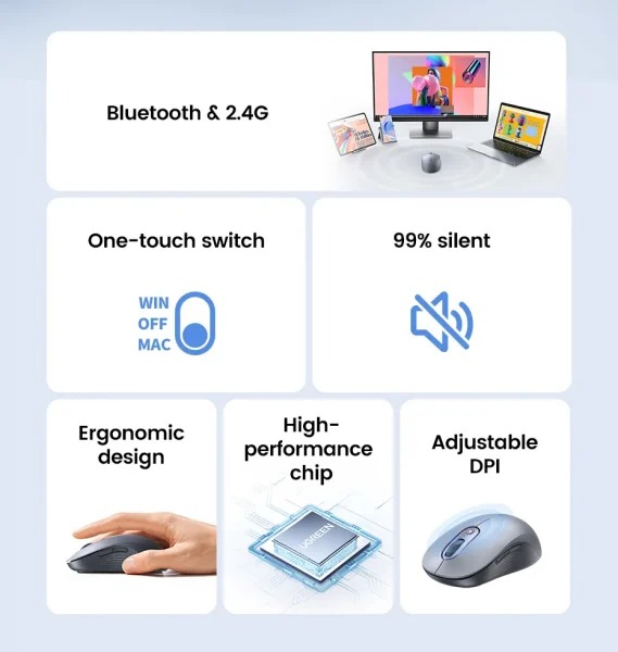 Chuột không dây 2.4Ghz + Bluetooth dùng cho máy tính laptop chất liệu nhựa ABS màu xám Ugreen 45149 M556