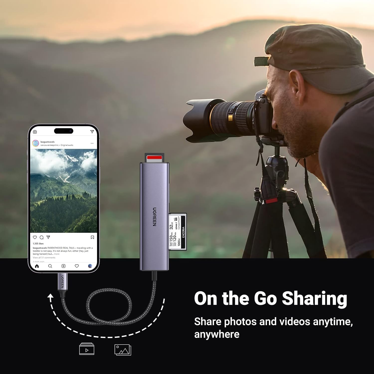 - Đầu đọc thẻ USB - C hỗ trợ SD/TF/CF 3.0/MS Ugreen 15307 CM627 : cho phép bạn truyền video của thẻ SD và Micro SD từ máy ảnh DSLR sang máy tính xách tay MacBook Pro hoặc USB C một cách dễ dàng. Không bao giờ bỏ lỡ mọi khoảnh khắc.