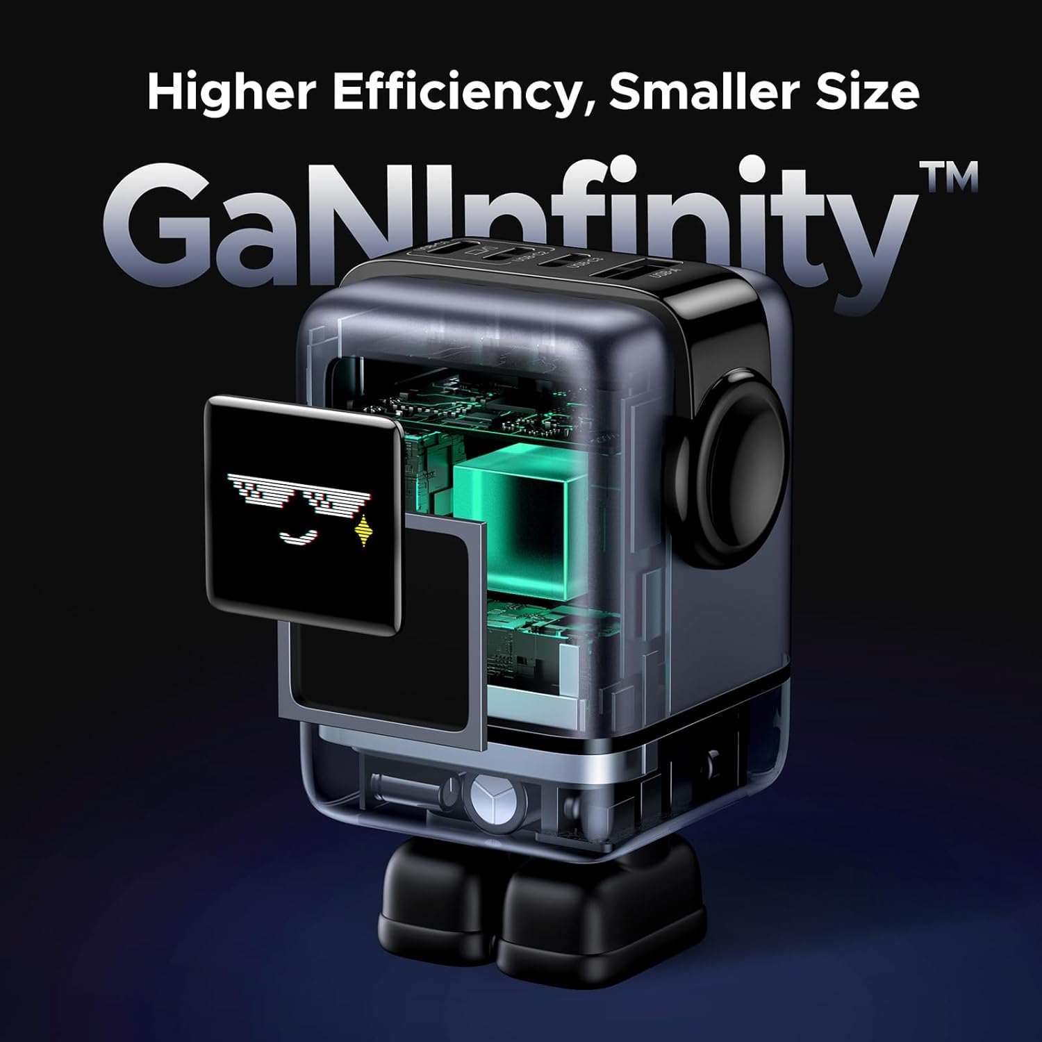 - Củ sạc Ugreen Robot Uno 3C1A 100W 4 cổng PD GAN Ugreen 45514B: hình dạng robot, màn hình TFT nâng cấp từ đèn LED, hiển thị nhiều biểu cảm thú vị hơn theo các trạng thái sạc khác nhau. Chân đế có nam châm, có thể gắn vào máy tính xách tay mà không bị rơi (Lưu ý: Biểu thức chỉ xuất hiện khi bật nguồn.)