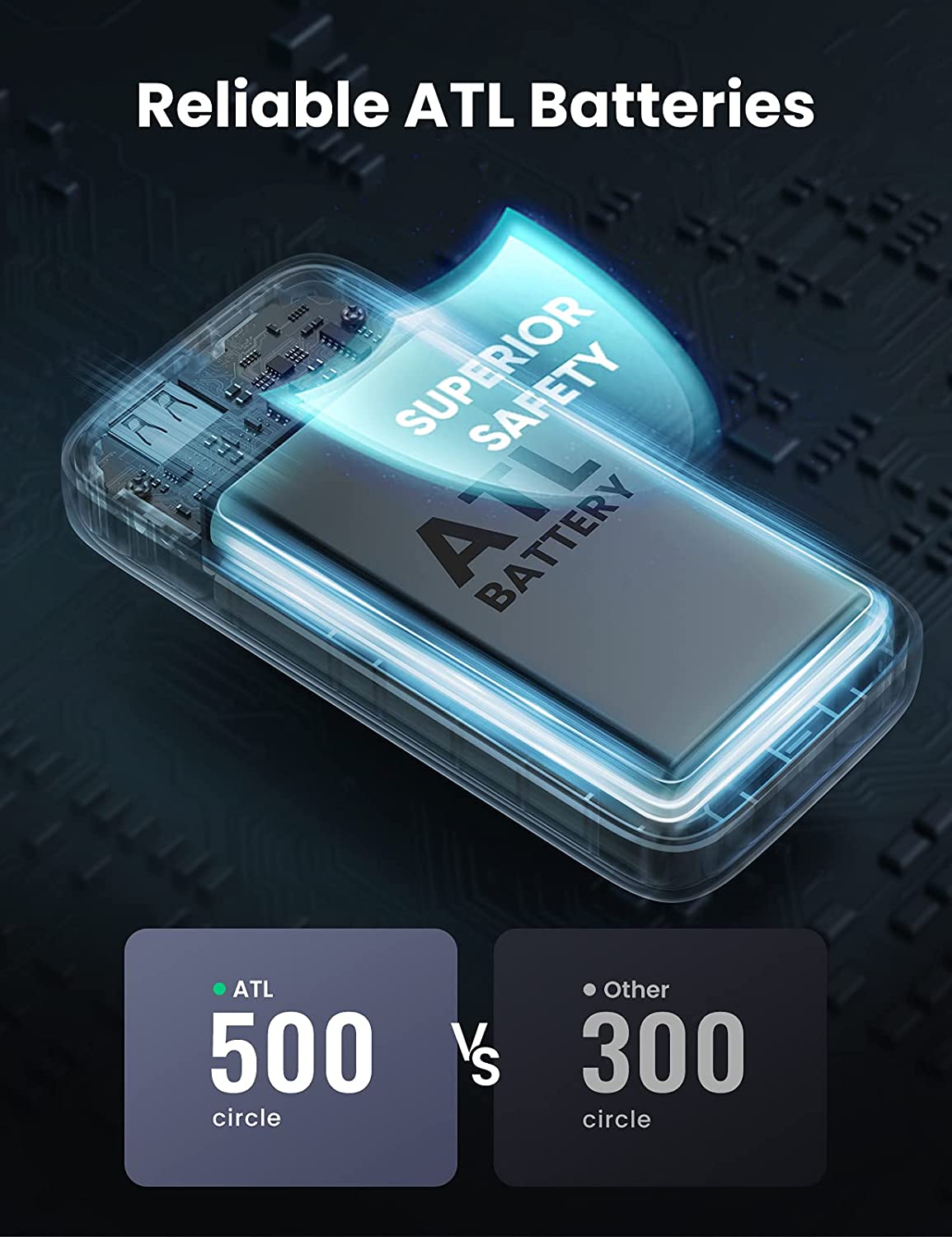 - Pin ATL cao cấp và an toàn: Sạc dự phòng UGREEN được trang bị pin lithium polymer mật độ cao ATL khổng lồ trong ngành, với quy trình tự sản xuất tương tự như pin điện thoại di động. Pin ATL cải thiện đáng kể độ ổn định và tuổi thọ có thể tái chế của pin dự phòng, thậm chí vẫn còn 80% dung lượng sau 500 chu kỳ.