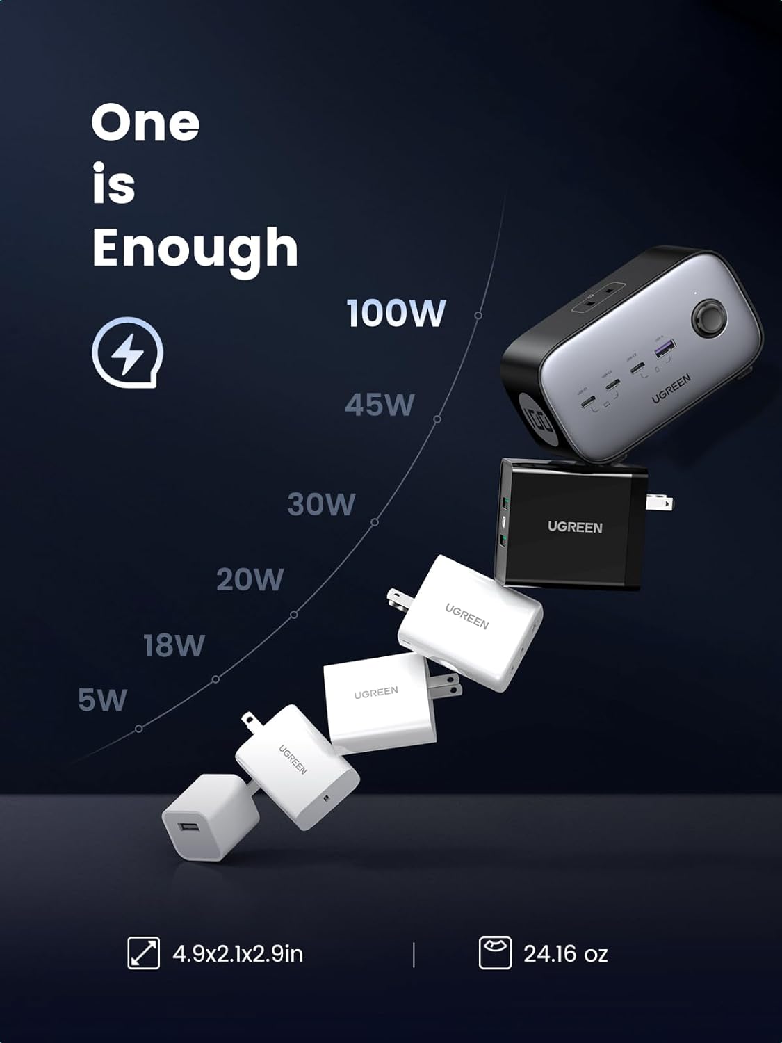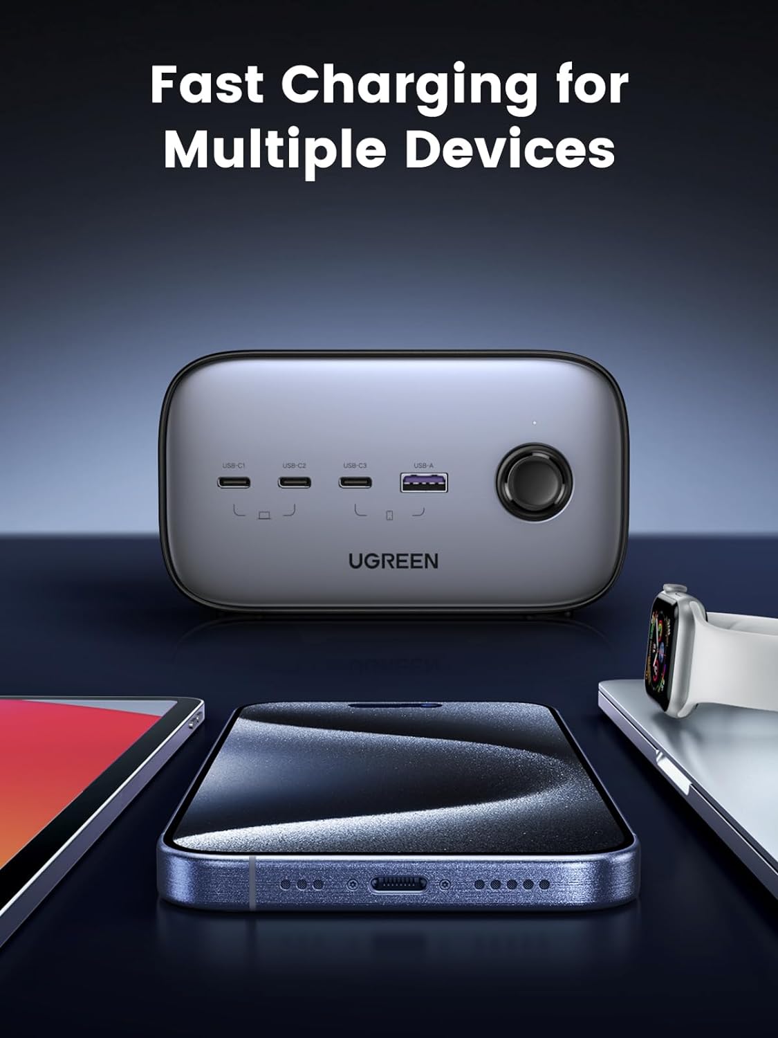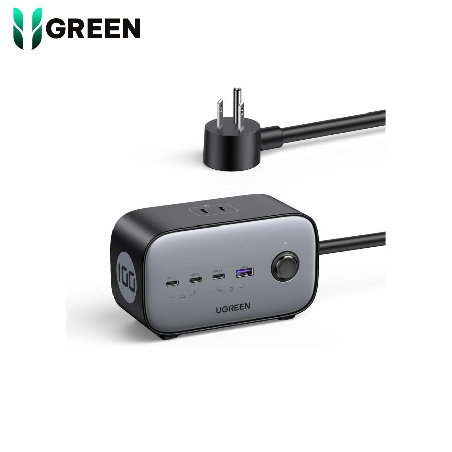 - Với 3 cổng USB-C, 1 cổng USB-A và 3 ổ cắm AC (1875W/15A), Trạm sạc Ugreen 100W có thể sạc tối đa 7 thiết bị cùng lúc và mang đến một không gian sạc không bị lộn xộn máy tính để bàn.