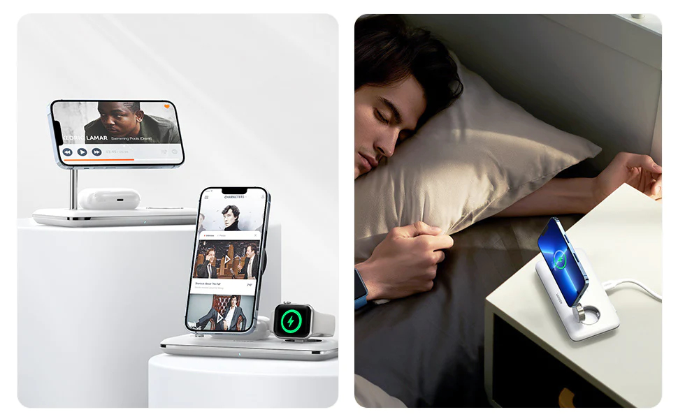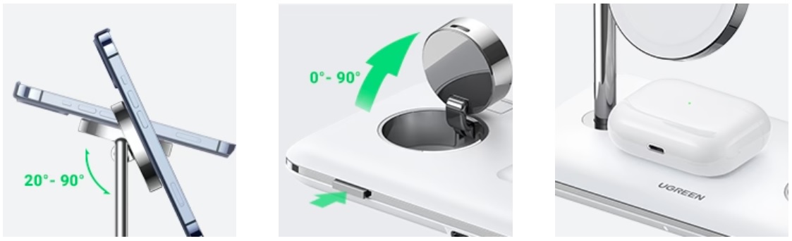 - Bộ sạc không dây từ tính cũng có thể hoạt động như một giá đỡ để giữ điện thoại và đồng hồ của bạn. Kiểm soát hoàn toàn góc nhìn, từ 20 đến 90 độ cho điện thoại và 0 đến 90 độ cho đồng hồ. Dù là hội nghị truyền hình, tìm kiếm thông tin, Định giờ khuôn mặt, xem video.