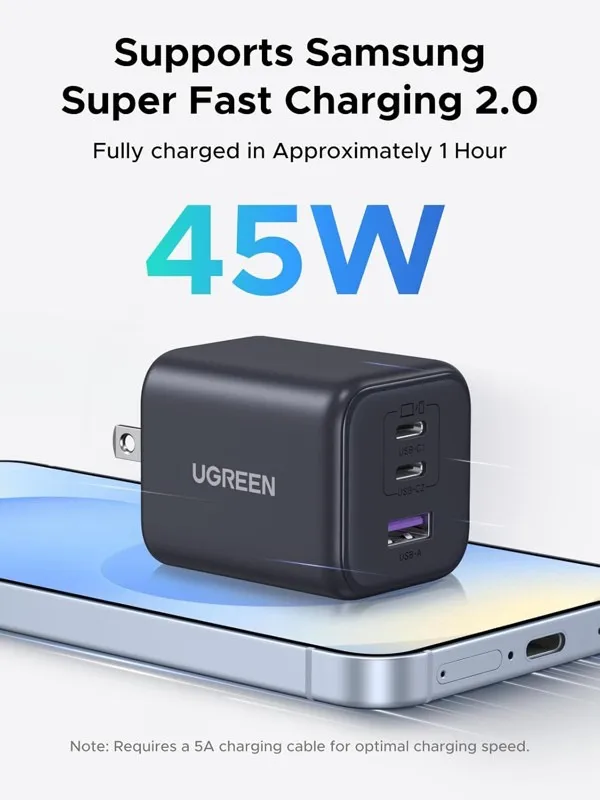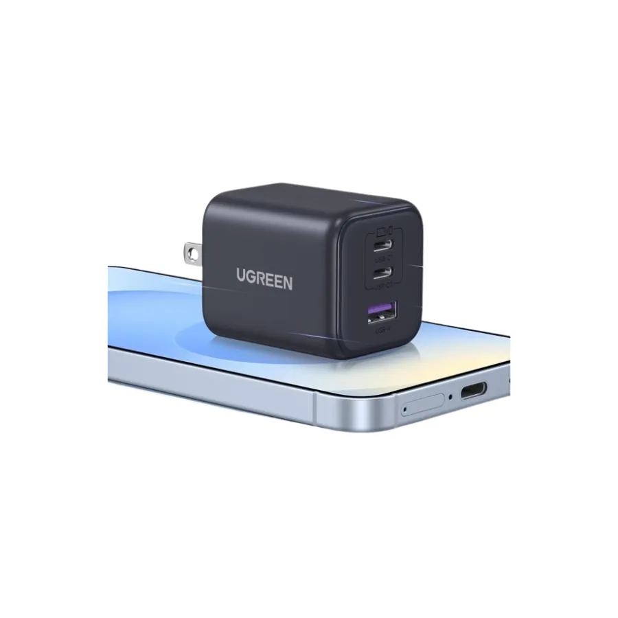 Sạc điện thoại 3 cổng USB-C và USB-A GaN 45W màu đen chân US Ugreen 65155B X527
