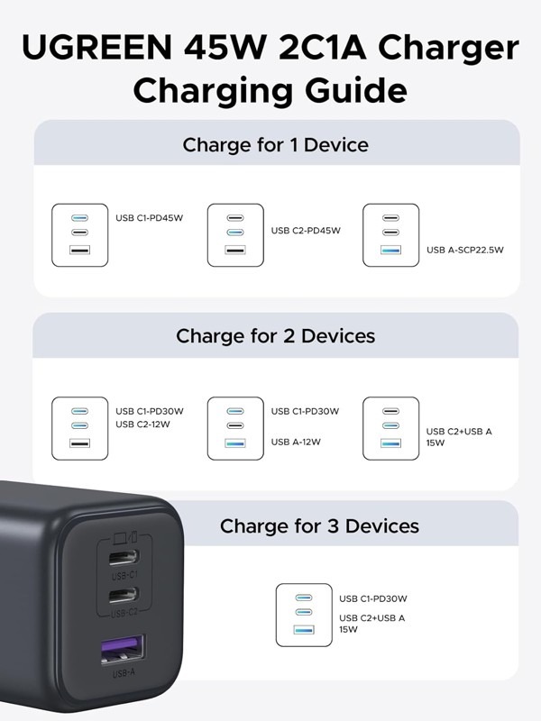 - USB-C1/C2 Output: 5.0V⎓3.0A/9.0V⎓3.0A/12.0V⎓3.0A/15.0V⎓3.0A/20.0V⎓2.25A 45.0W Max