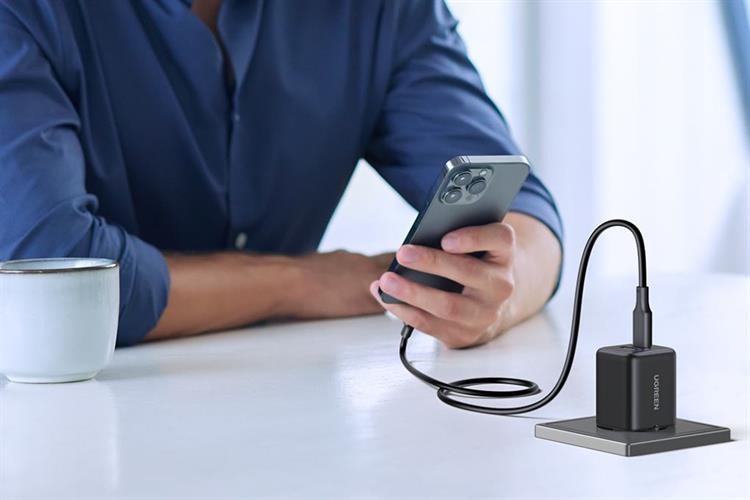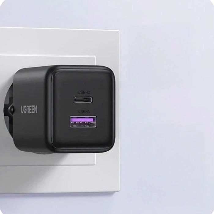 Sạc điện thoại 2 cổng USB-C và USB-A GaN 30W màu đen chân cắm dẹt Ugreen 65025 X516