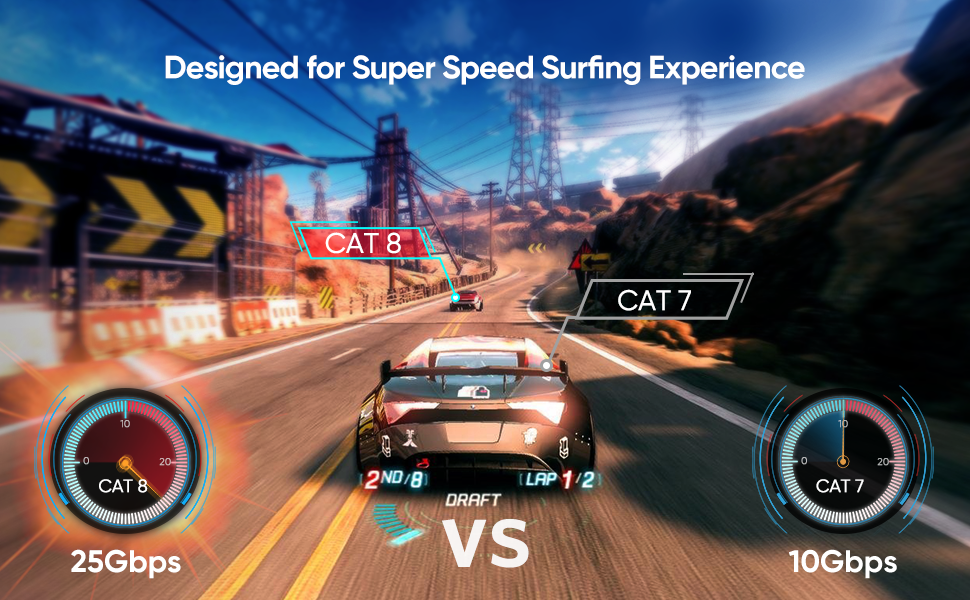 - Tính năng với đầu nối RJ45 thông thường, Cáp Ethernet Cat 8 Class I này cung cấp khả năng truyền dữ liệu nhanh 25Gbps, nhanh hơn 25 lần so với CAT6 (1000Mbps), không bao giờ lo lắng về độ trễ.