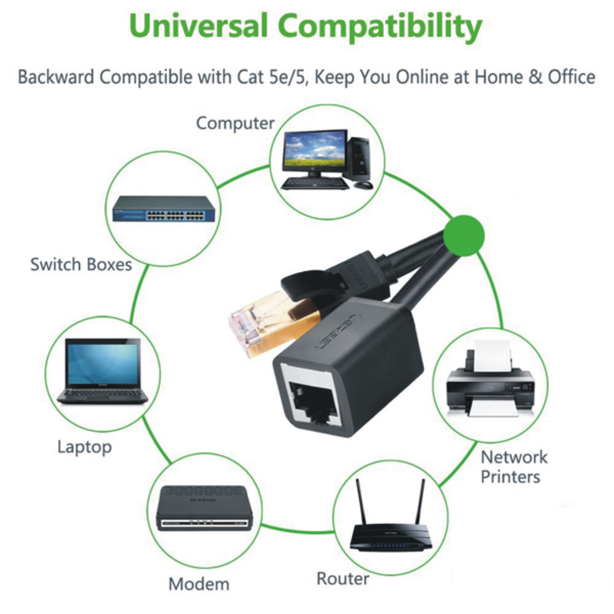 - Cáp mạng Cat6 Ugreen 11280, cung cấp các kết nối phổ thông cho các thành phần mạng LAN như máy tính, máy chủ, máy in, thiết bị định tuyến, hộp chuyển đổi, mạng người chơi phương tiện truyền thông, NAS, điện thoại VoIP, thiết bị PoE, và nhiều hơn nữa.