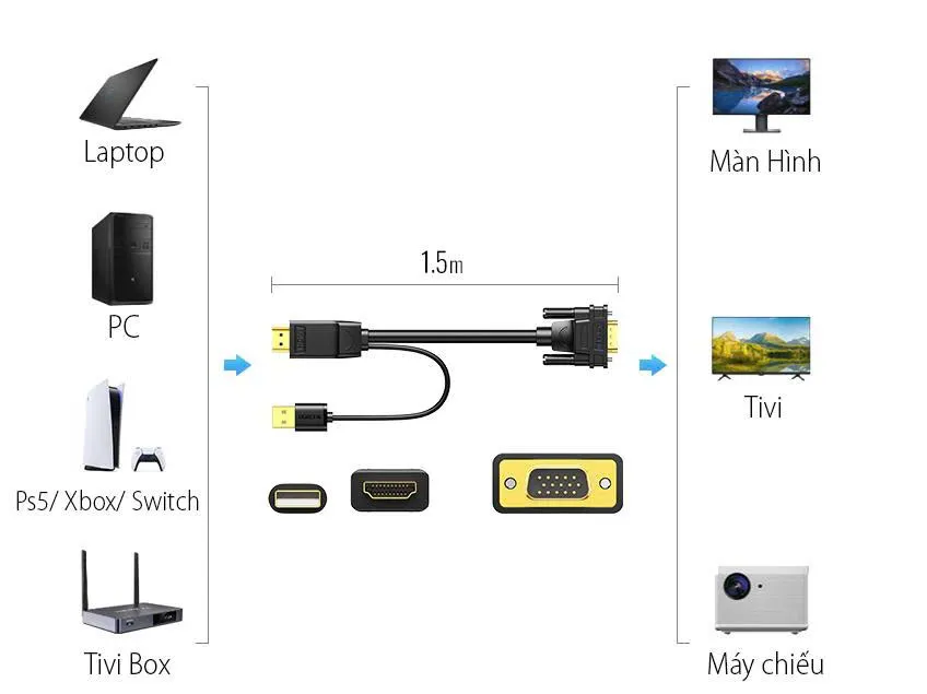 - Cáp chuyển HDMI to VGA Ugreen 30449 cho phép bạn kết nối với máy tính xách tay, Apple TV, Chromebook, Raspberry Pi, HD DVD, HD DV với giao diện HDMI để chiếu, hiển thị lên màn hình LCD, TV & Màn hình với giao diện VGA để xem màn hình lớn .
