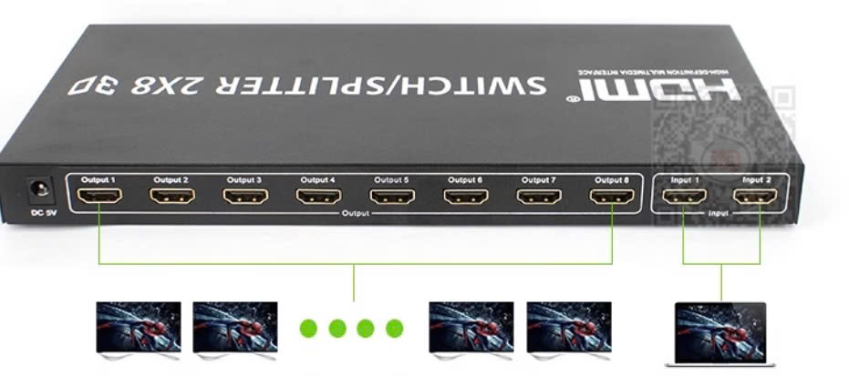 - Bộ chia HDMI 2 ra 8 hỗ trợ 4K KTECH, thông qua một nhóm các tín hiệu đầu ra HDMI với nhiều tín hiệu HDMI đó. Bộ chia HDMI được sử dụng cho ngành công nghiệp truyền hình độ nét cao, kỹ thuật hoạt động lĩnh vực, truyền hình vệ tinh hộp set-top, DVD, chiếu, giám sát trung tâm dữ liệu, giáo dục, đào tạo của công ty với một giải pháp lý tưởng đề ra.