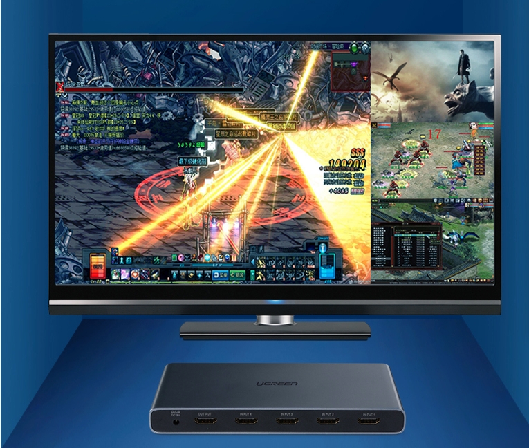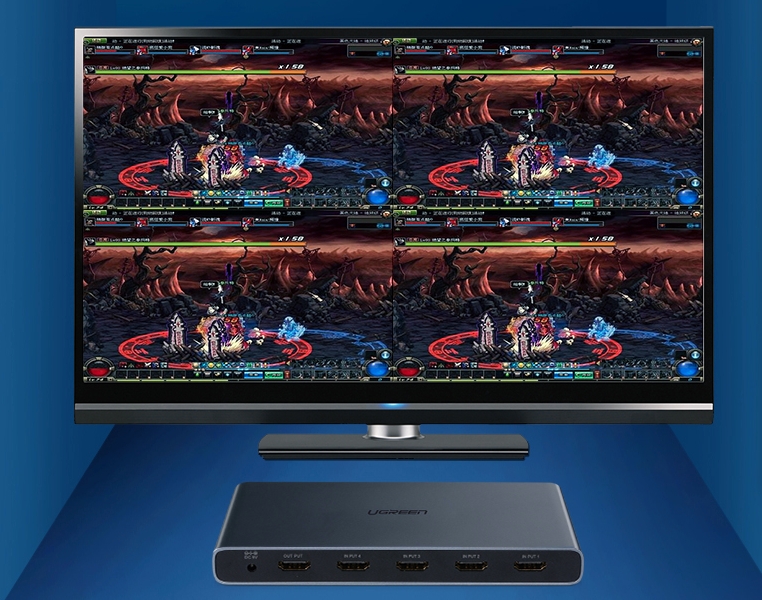 - Bộ chia HDMI 4 ra 1 multi viewer Ugreen bộ chia màn hình 4x1 hiển thị 4 tín hiệu hình ảnh cùng lúc trên 1 màn hình tức là màn hình sẽ chia làm 4 khung nhỏ hiển thì 4 tín hiệu HDMI đầu vào cùng lúc.