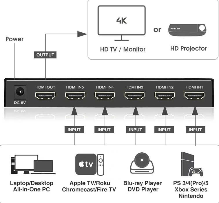 - Đầu vào: HDMI*5 ( 5 thiết bi PC / laptop ... )