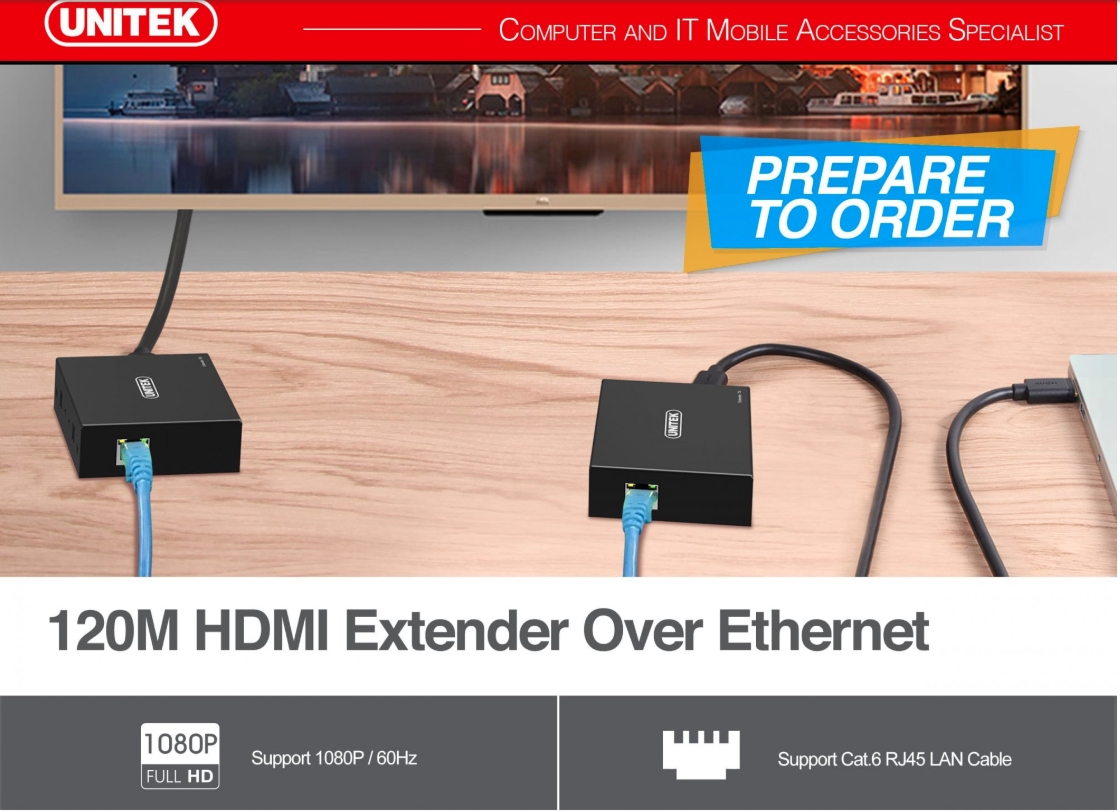 - Bộ khuếch đại HDMI qua mạng Lan Unitek V101A, được thiết kế với mục đích mở rộng tín hiệu HDMI qua đường cáp mạng, ngõ vào là các nguồn phát xuất ra ngõ HDMI, ngõ vào cho máy chiếu, màn hình các loại...