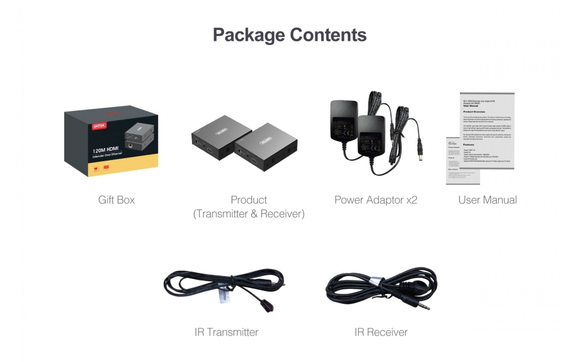 - Bộ sản phẩm bao gồm: 1 Sender, 1 Receiver, 2 adater 5V 1A
