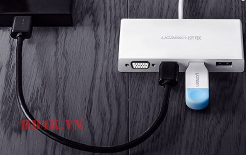 - Cáp chuyển Type C sang Hub USB 3.0 & VGA Ugreen 40375 được thiết kế để kết nối Macbook với cổng USB-C tới màn hình hoặc máy chiếu thông qua cổng VGA