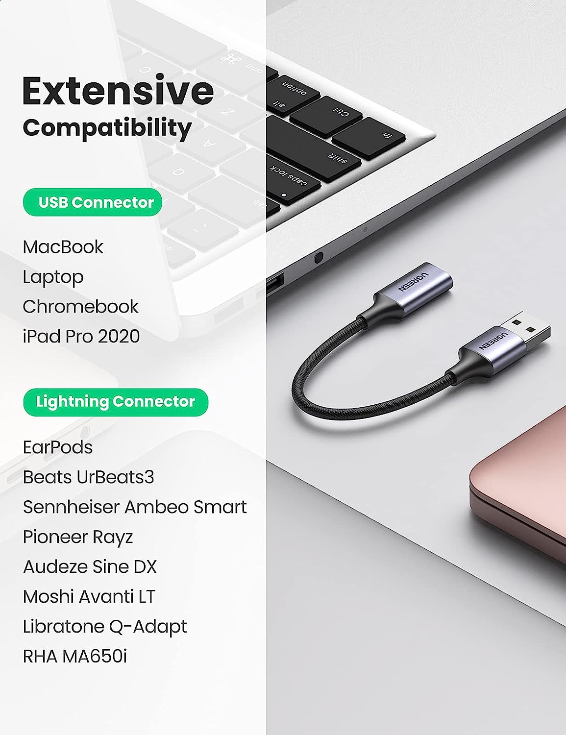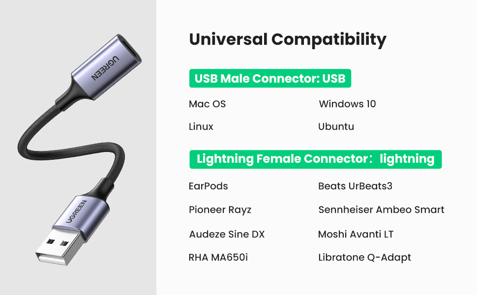 - Khả năng tương thích rộng: Cáp chuyển đổi UGREEN USB A sang lightning tương thích rộng rãi với Macbook Pro/Air, máy tính bảng USB, máy tính xách tay, PC chạy Windows 10 trở lên, MacOS, Linux, Ubuntu. Vì vậy, bạn có thể dễ dàng kết nối tai nghe chống sét của mình với các thiết bị USB A bằng cáp bộ chuyển đổi này.