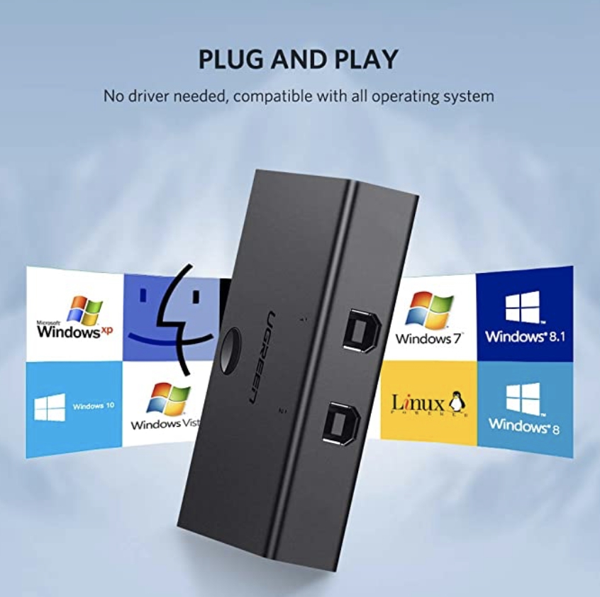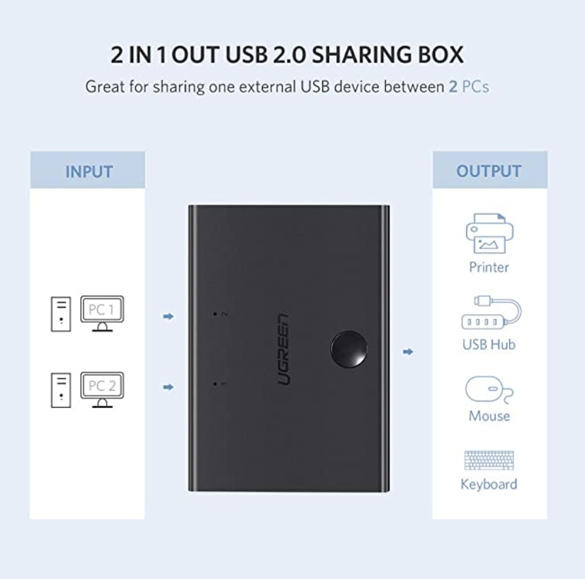 - Bộ Chia USB 2.0 Cho 2 Máy Tính Ugreen 30345 là thiết bị lý tưởng dùng để chia sẻ thiết bị USB như máy in, USB, máy quét, ổ đĩa gắn ngoài hoắc các thiết bị ngoại vi USB khác với 4 máy tính (một máy tính có quyền truy cập tại một thời điểm), bạn có thể dễ dàng chuyển đổi giữa bốn máy tính này chỉ với một phím bấm.