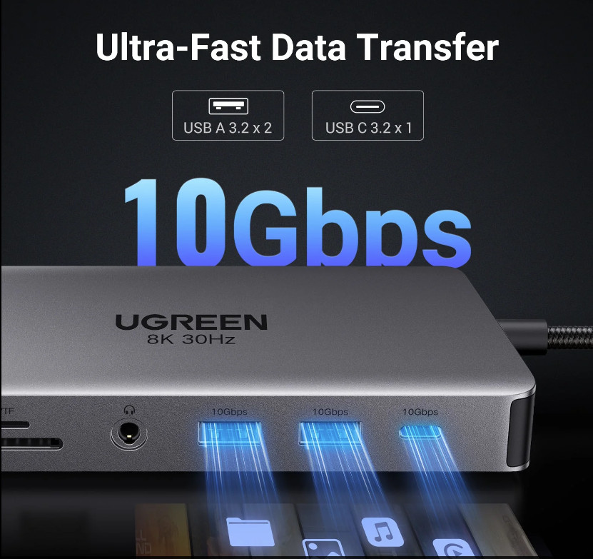Bộ chuyển đổi Type C sang 2*USB-A 3.2+1*USB-A 3.0+1*USB-C 3.2+2*HDMI 8K@30Hz+LAN+SD/TF+3.5mm Ugreen 15965
