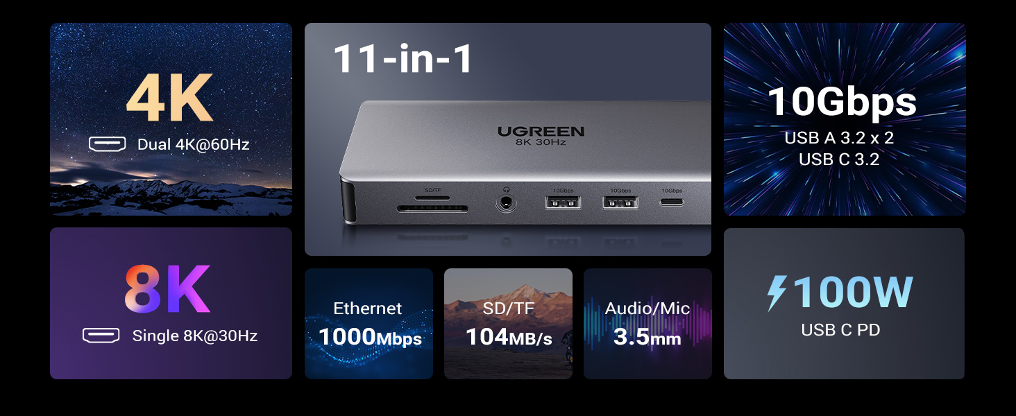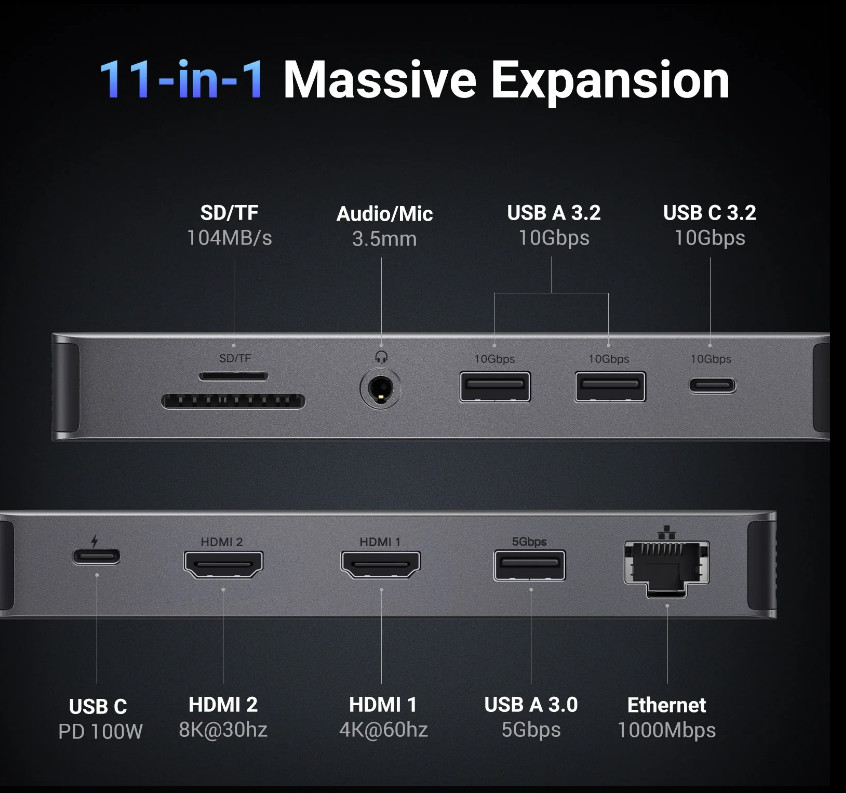 - Output: 1*USB-A 3.0Female, 2*USB-A3.2, 1*USB-C 3.2,2*HDMI, 1*RJ45 Gigabit, 1*TF slot, 1*SD slot, 3.5mm, PD