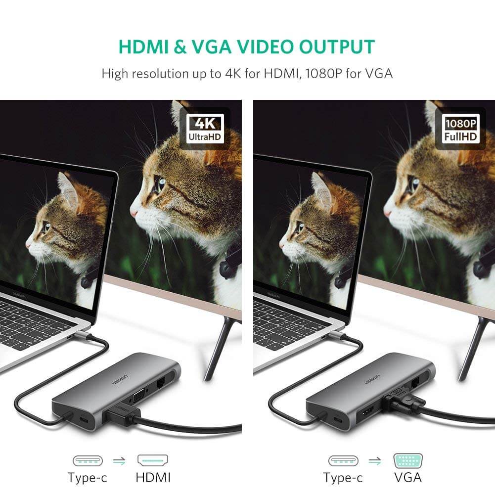 - USB C to VGA: Bộ chuyển đổi USB-C đa năng Ugreen 40873 còn hỗ trợ cổng kết nối VGA độ phân giải FullHD 1920x1080P@60Hz giúp bạn dễ dàng kết nối chia sẻ hình ảnh từ máy tính với máy chiếu, màn hình chuẩn VGA. Với thiết bị này bạn có thể sử dụng với hầu hết các chuẩn màn hình hiện nay.