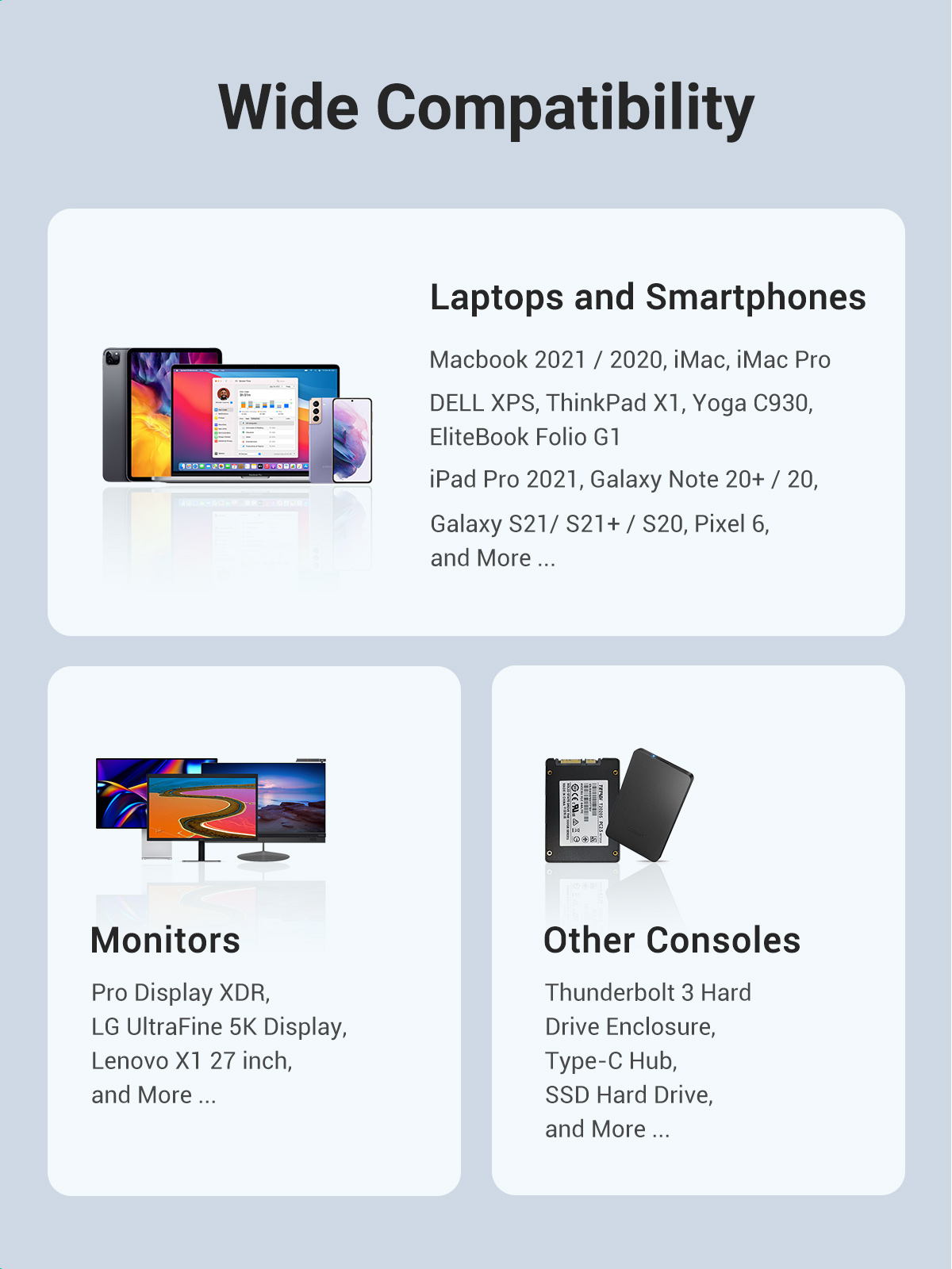 - Khả năng tương thích rộng: Hoạt động hoàn hảo với tất cả các thiết bị USB-C. Tương thích với Macbook Pro, Air, iMac, Huawei MateBook, Dell XPS13 XPS15, HP Spectre, EliteBook, Lenovo Carbon X1, ThinkPad X1, Samsung NoteBook, Razer Blade, Docking Stations, Hard Drives, eGPUs, v.v.