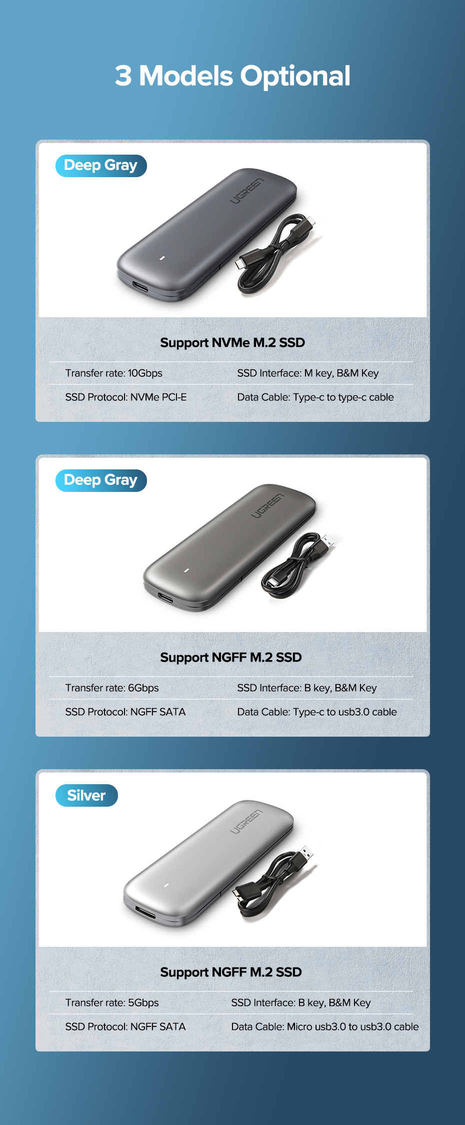 - Box SSD Ugreen M.2 hỗ trợ B-Key & M+B Key 2280/2260/2242/2230 NGFF M.2 ổ cứng thể rắn lên đến 2TB, như WD Blue / Crucial MX500 / Kingston A400 / Samsung 860 EVO.