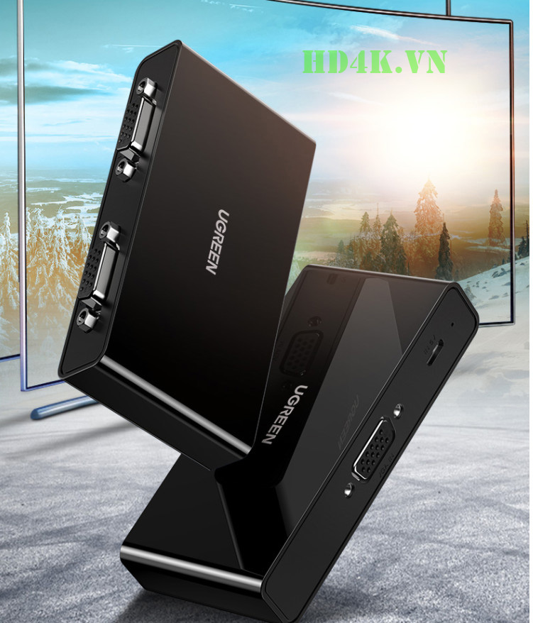- Bộ chia VGA 1 ra 2 Ugreen 80910 cho phép bạn đồng thời phân phối tín hiệu video VGA từ một nguồn duy nhất để 2 VGA màn hình, máy chiếu hoặc màn hình, cung cấp hình ảnh sống động chất lượng. Thích hợp trình chiếu cho đào tạo, triển lãm, hội nghị,..