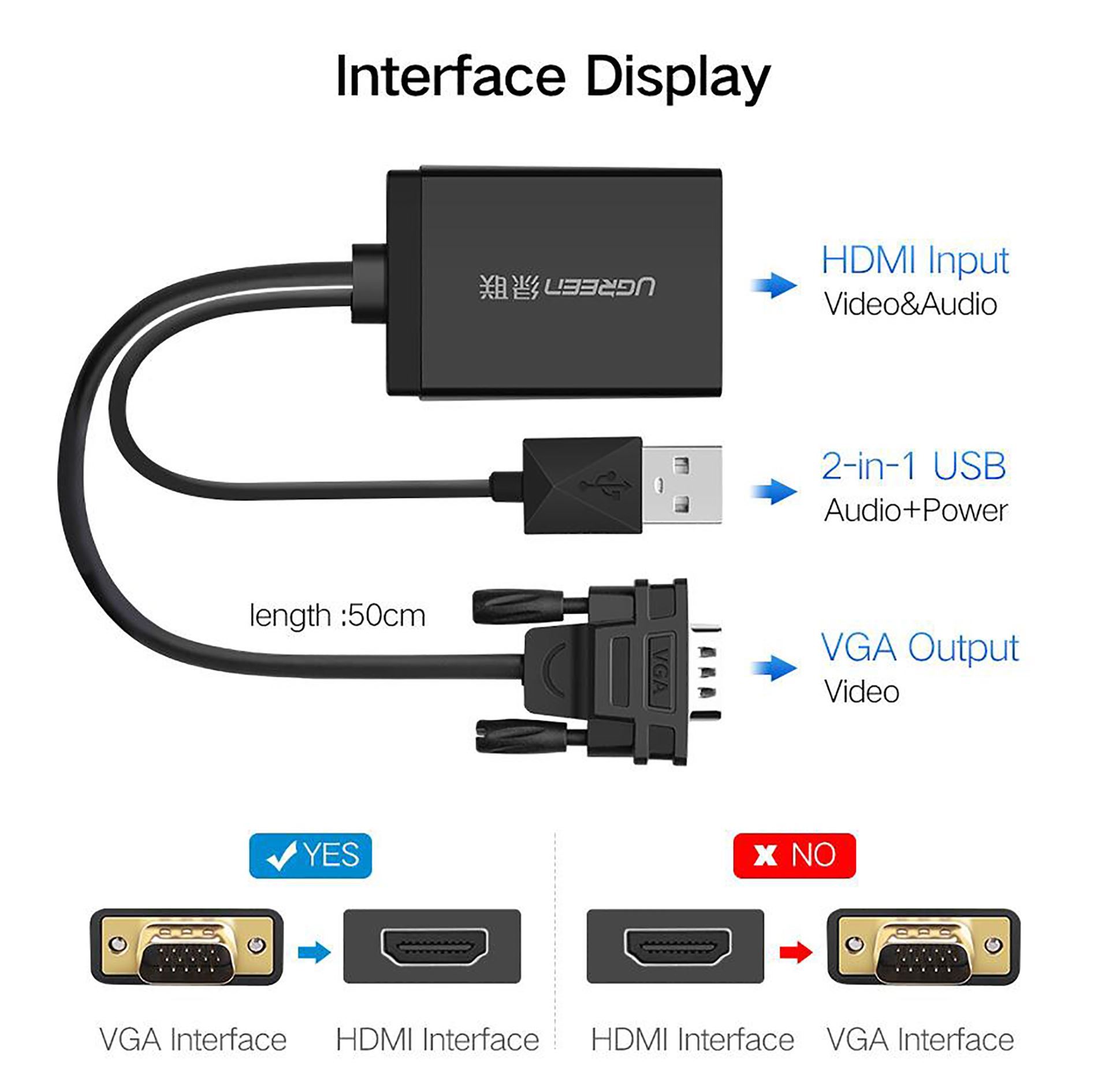 - Cáp chuyển VGA Audio to HDMI ugreen 40213, chuyên dùng để chuyển đổi tín hiệu từ chuẩn VGA sang tín hiệu chuẩn HDMI