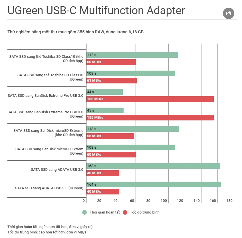 Kết quả như anh em có thể thấy trong biểu đồ trên, tốc độ truy xuất của các thiết bị lưu trữ khi đọc qua adapter Ugreen đều không thay đổi nhiều và đặc biệt là khe thẻ SD, nó còn cho tốc độ truy xuất cao hơn so với khe thẻ SD tích hợp trên ThinkPad P70. Trong khi đó tốc độ truy xuất của 2 chiếc USB mình thử nghiệm đều ngang nhau.