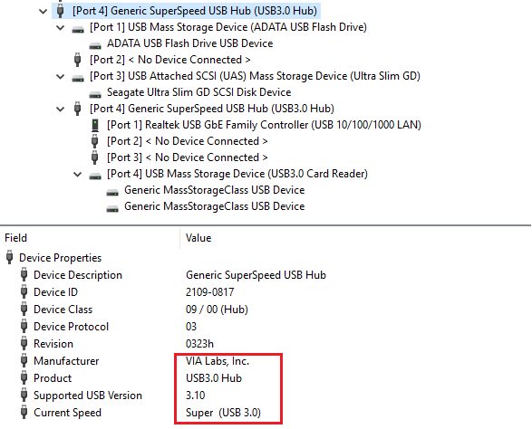 Mình dùng thử chiếc adapter này với ThinkPad P70 để kiểm tra hiệu năng của nó so với những cổng kết nối tương tự có trên máy tính. Kiểm tra bằng HWInfo thì mình phát hiện ra chiếc adapter này dùng chuẩn USB 3.1 Gen2 với băng thông 10 Gbps hay 1,25 GB/s. Thành ra khi cắm 3 chiếc USB đều dùng chuẩn 3.0 (3.1 Gen1 5 Gbps) thì chiếc adapter này vẫn hỗ trợ đủ băng thông, vẫn nhận USB 3.0, không bị đạp xuống USB 2.0.