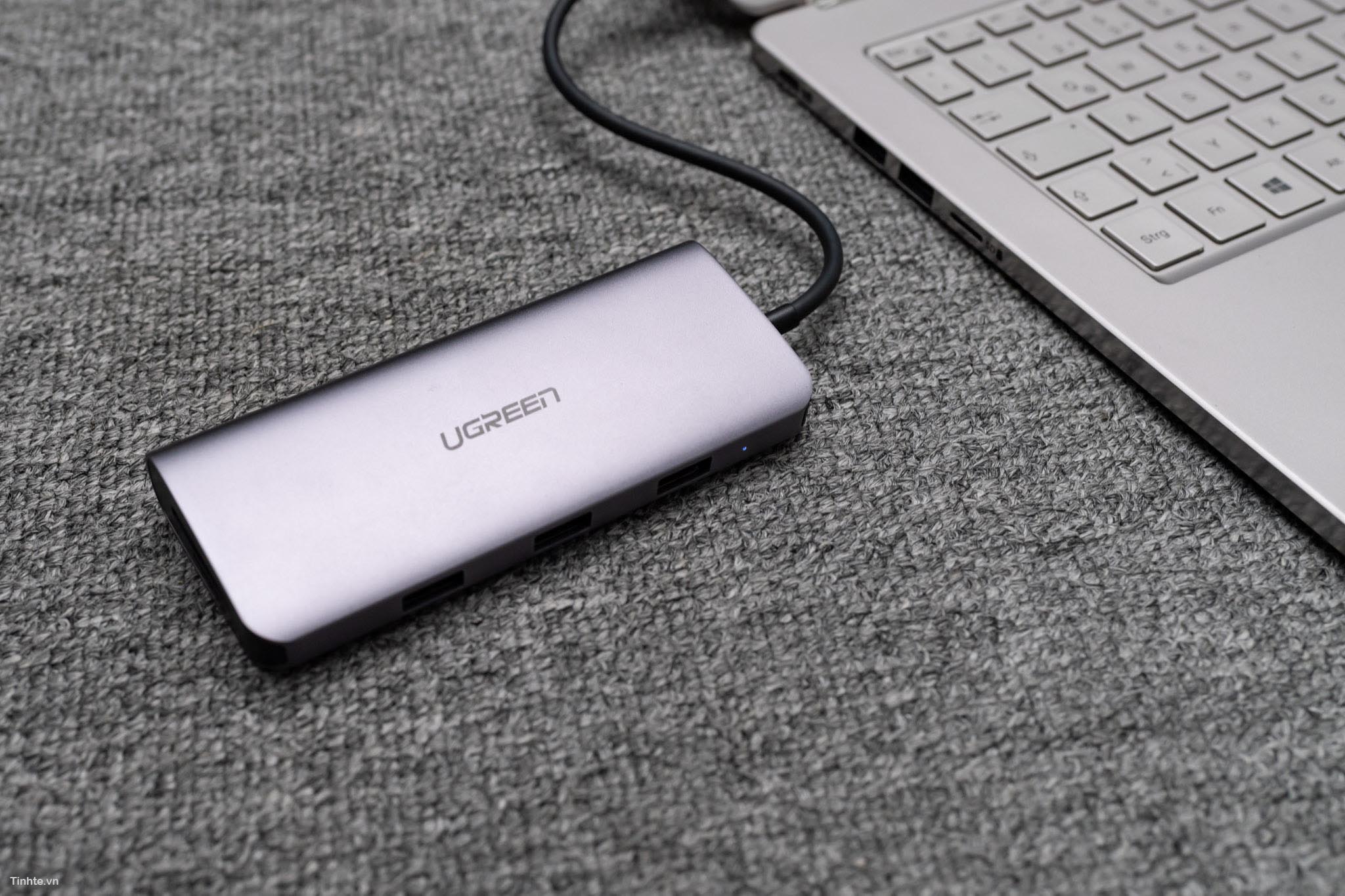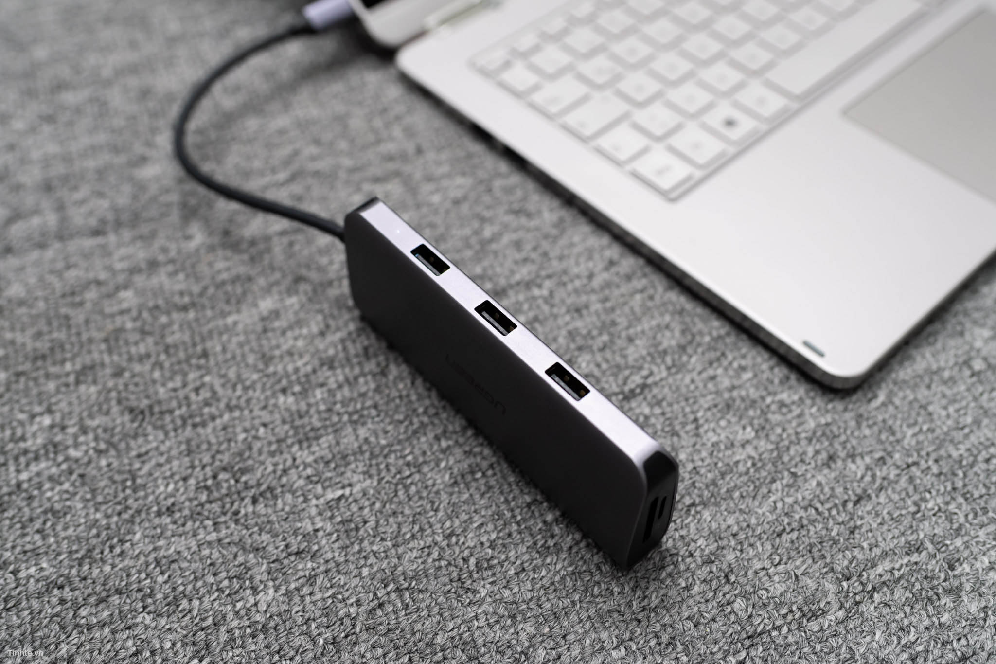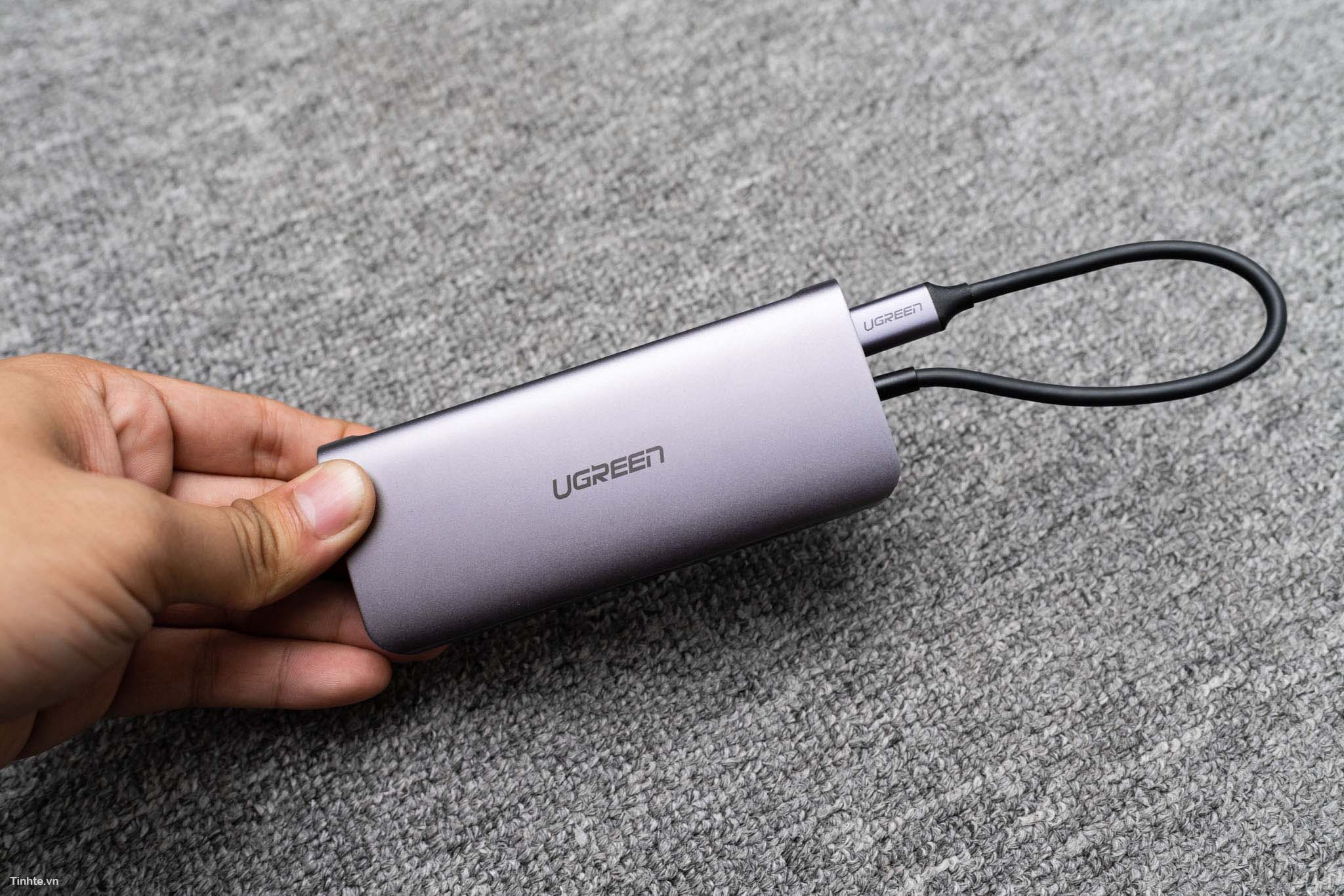 Chiếc adapter USB-C Multifunction của Ugreen có thiết kế na ná với nhiều giải pháp hub chia USB-C ra nhiều cổng hiện tại với vỏ nhôm, phần khung bằng nhựa dày và có dây USB-C gắn ngoài. Thiết kế này theo đánh giá của mình tiện dụng hơn so với cổng USB-C gắn chết trên adapter bởi có thể dùng với nhiều loại máy chứ không chỉ riêng MacBook. Thêm nữa là nó dùng dây cáp ngoài, dễ tháo và ít có nguy cơ làm hỏng cổng tiếp xúc hơn nếu chúng ta vô ý. Tuy nhiên, độ hoàn thiện của chiếc adapter này không cao lắm bởi phần nhựa vẫn còn thừa ra chút ít và các cổng USB-A hơi méo.